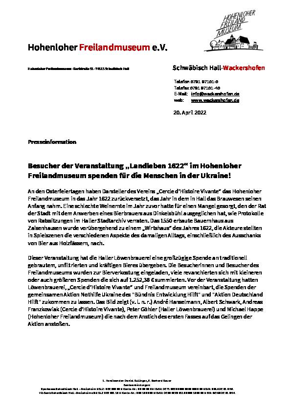 Besucher der Veranstaltung „Landleben 1622“ im Hohenloher Freilandmuseum spenden für die Menschen in der Ukraine!